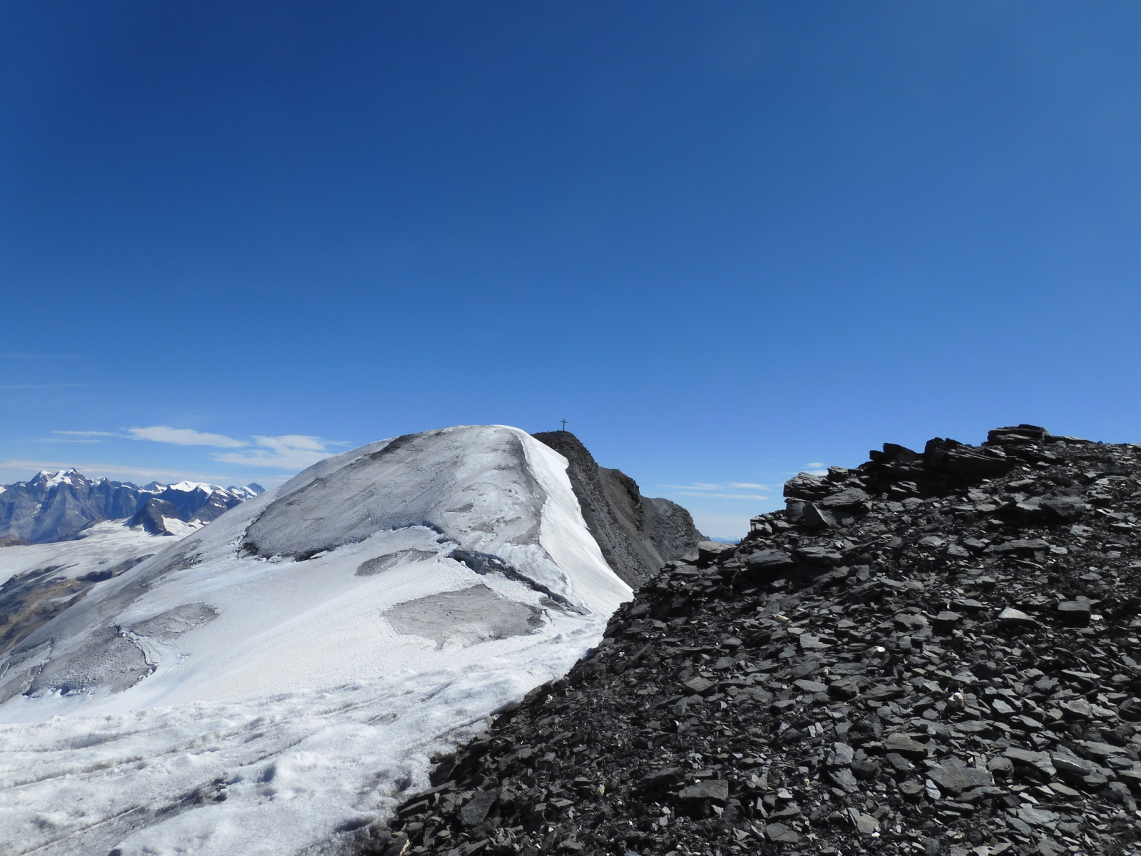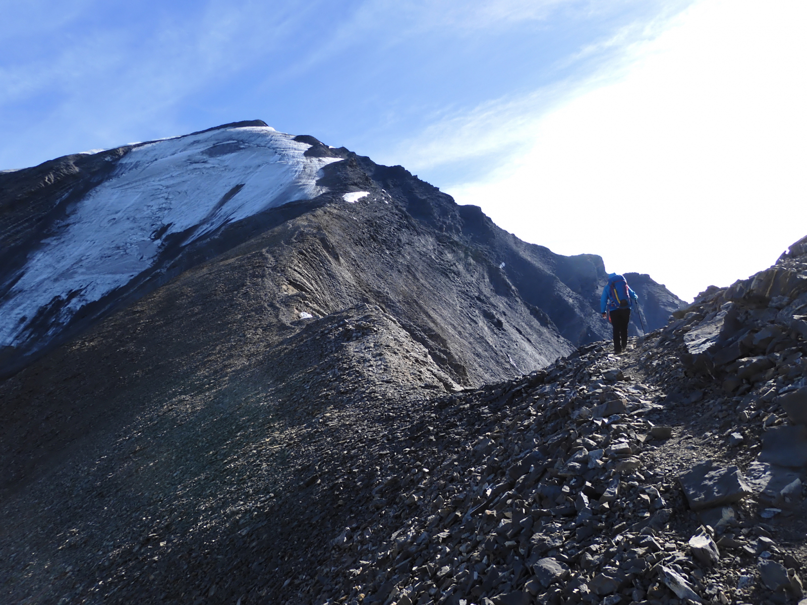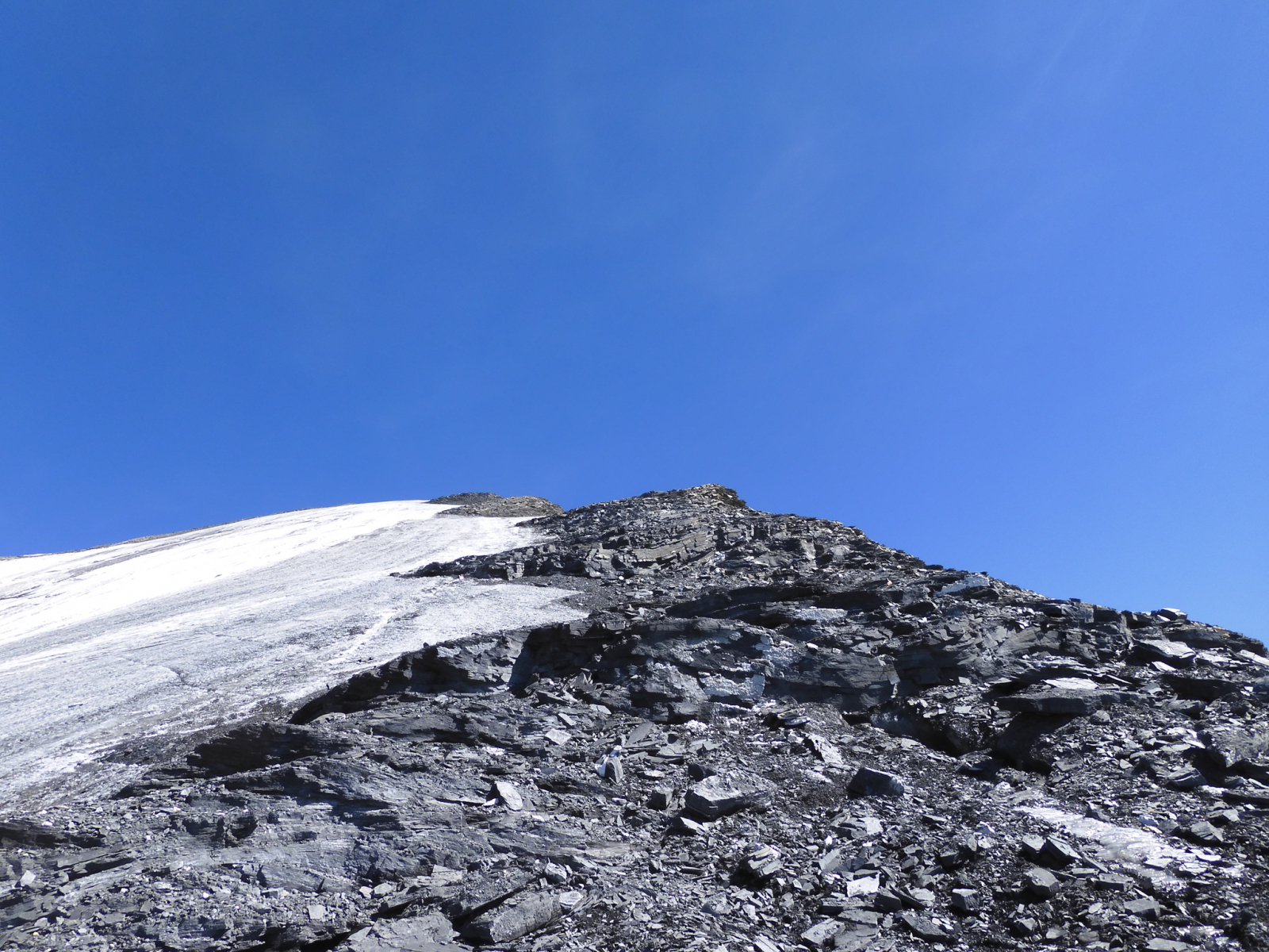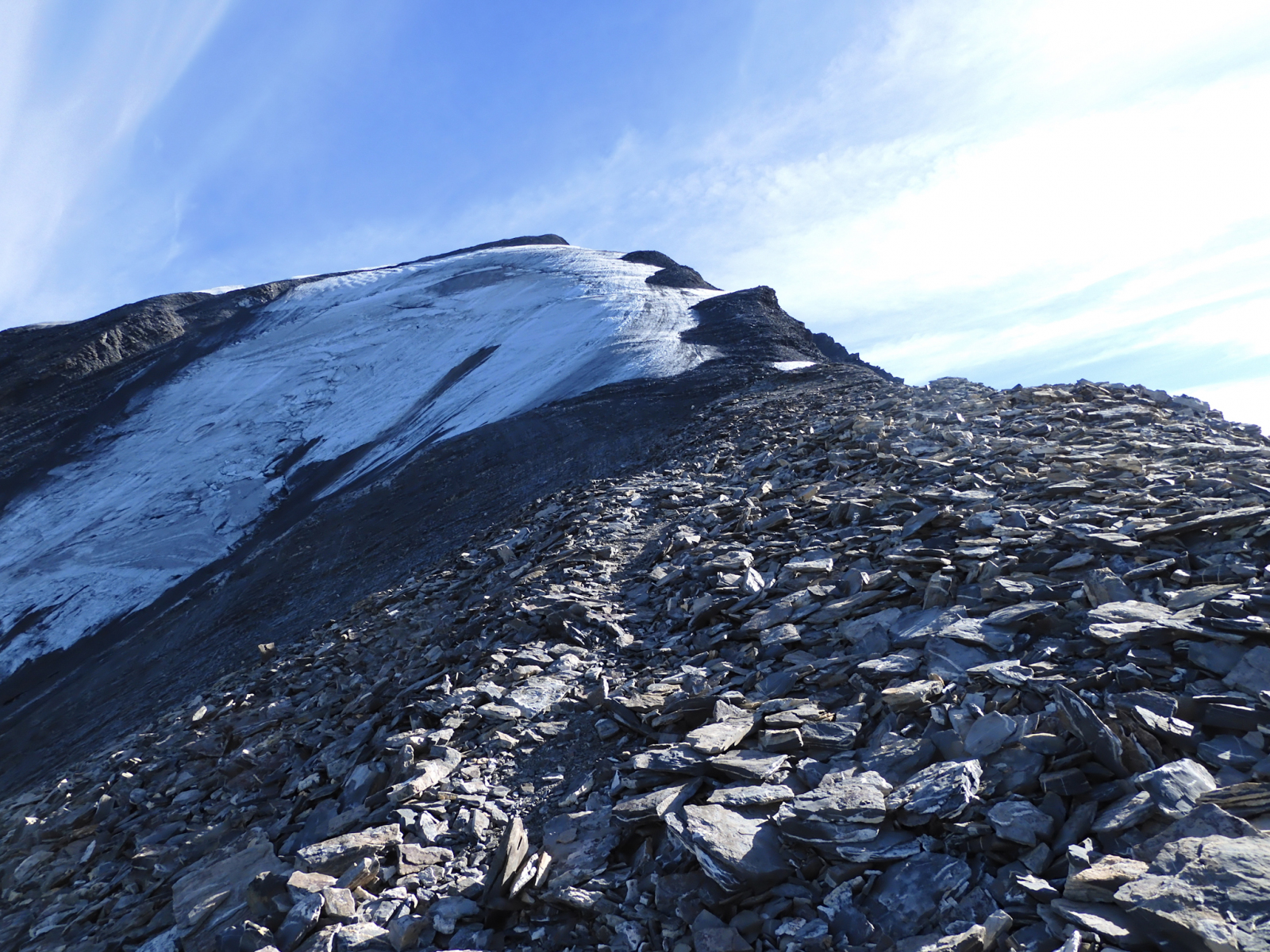 Nun folgt man dem felsigen Zackengrat, der im Sommer deutliche Wegspuren vorgibt. Dieser Wegabschnitt bietet bei trockenen Verhältnissen kaum Schwierigkeiten. Eine Steilstufe gegen Ende des Grates wird umgangen, indem man nördlich etwas ab- und anschliessend wieder zum Grat zurücksteigt. Man kann sie allerdings auch direkt angehen und überschreiten. Kurze zeit später heisst es Steigeisen anschnallen, man erreicht den breiten, mit Gletschereis bedeckten Gratteil, ein breiter Rücken und folgt diesem bis zum Vorgipfel. Direkt hinter dem Vorgipfel steigt man anschliessend ein wenig in einen Sattel ab und steigt anschliessend über den Firnhang zum Hauptgipfel. Auf dem Firnhang hat es Spalten.