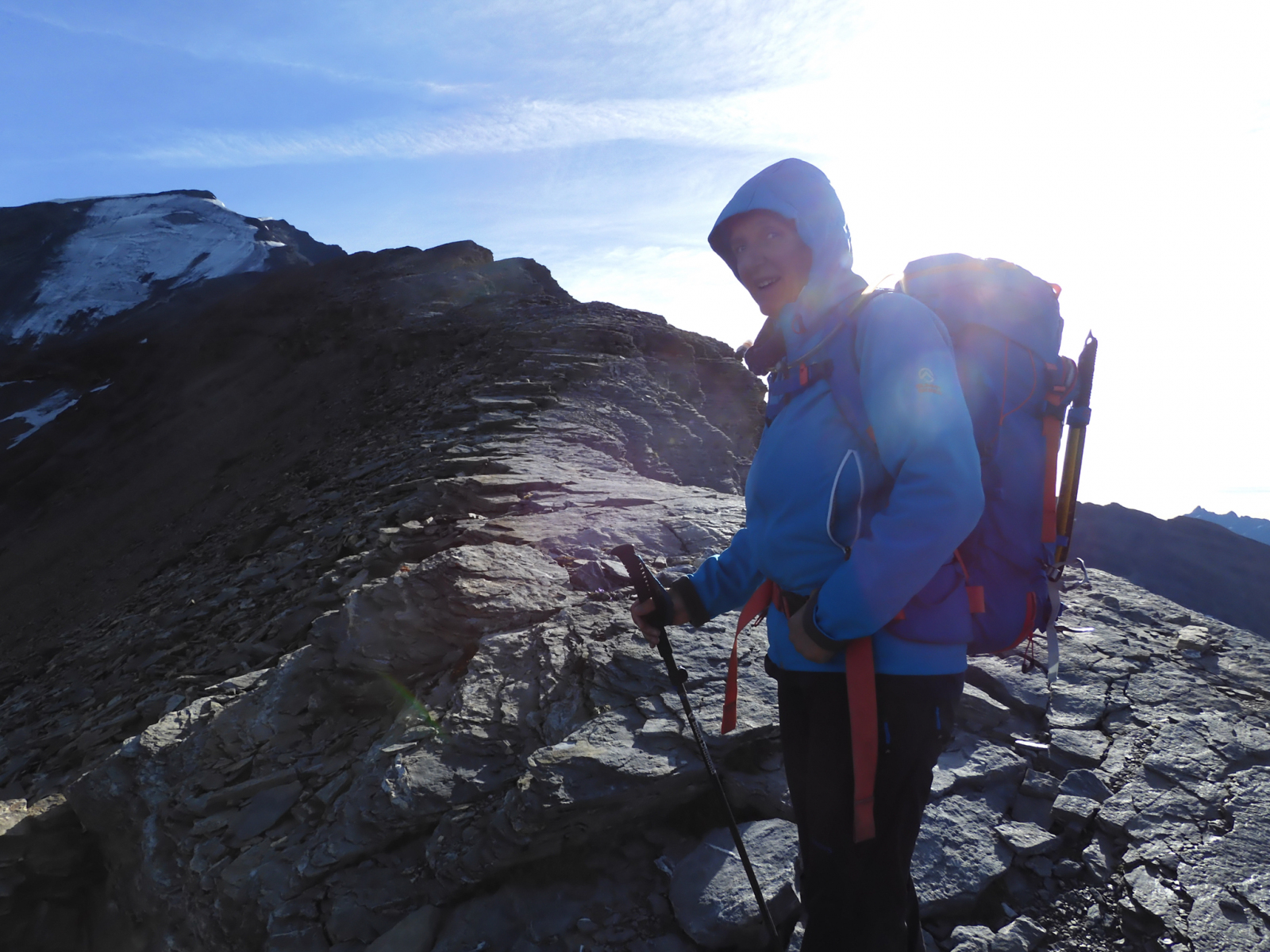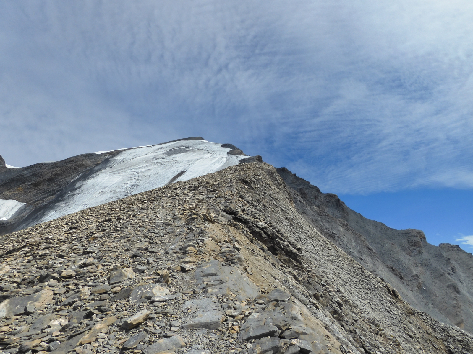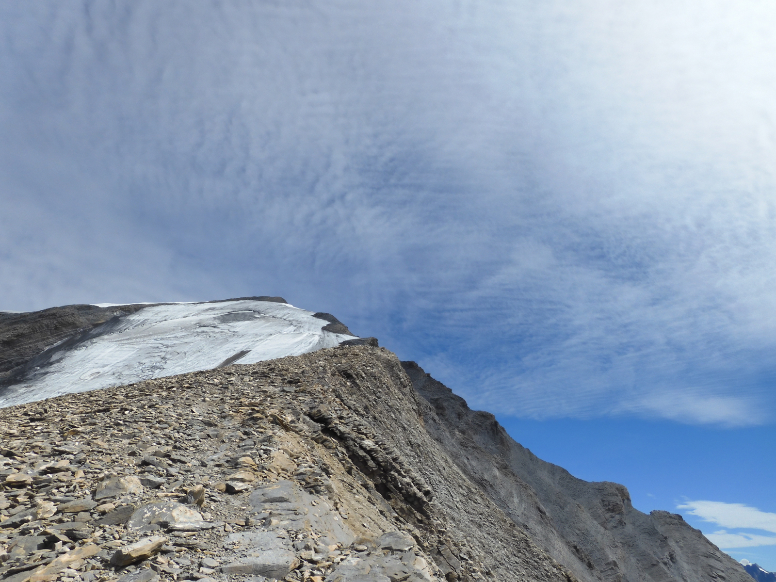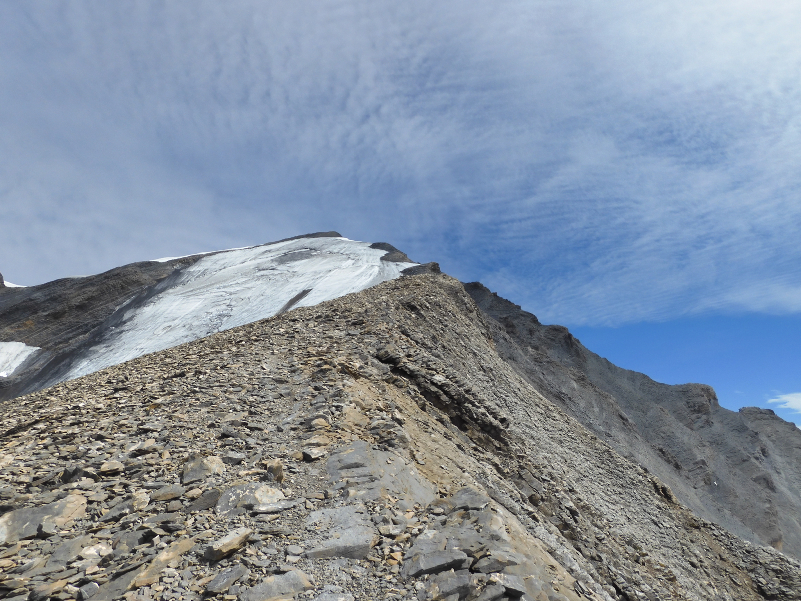Nun folgt man dem felsigen Zackengrat, der im Sommer deutliche Wegspuren vorgibt. Dieser Wegabschnitt bietet bei trockenen Verhältnissen kaum Schwierigkeiten. Eine Steilstufe gegen Ende des Grates wird umgangen, indem man nördlich etwas ab- und anschliessend wieder zum Grat zurücksteigt. Man kann sie allerdings auch direkt angehen und überschreiten. Kurze zeit später heisst es Steigeisen anschnallen, man erreicht den breiten, mit Gletschereis bedeckten Gratteil, ein breiter Rücken und folgt diesem bis zum Vorgipfel. Direkt hinter dem Vorgipfel steigt man anschliessend ein wenig in einen Sattel ab und steigt anschliessend über den Firnhang zum Hauptgipfel. Auf dem Firnhang hat es Spalten.