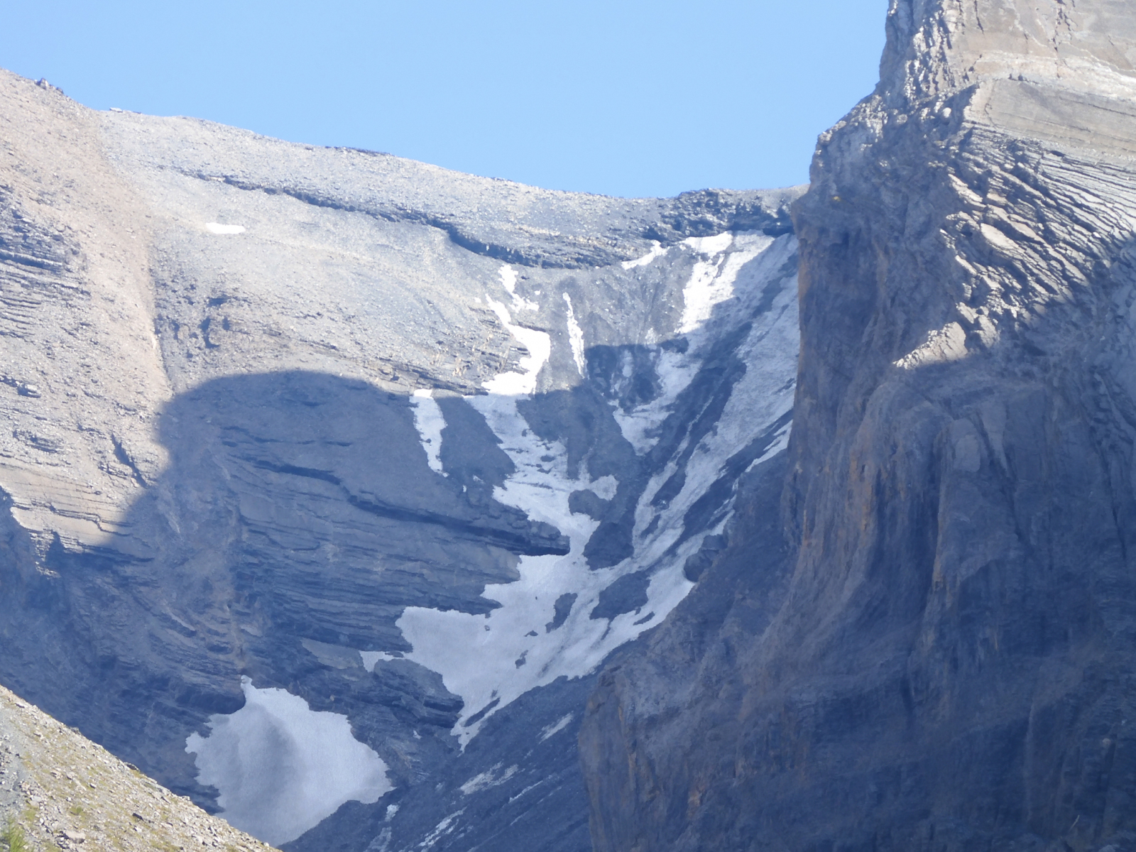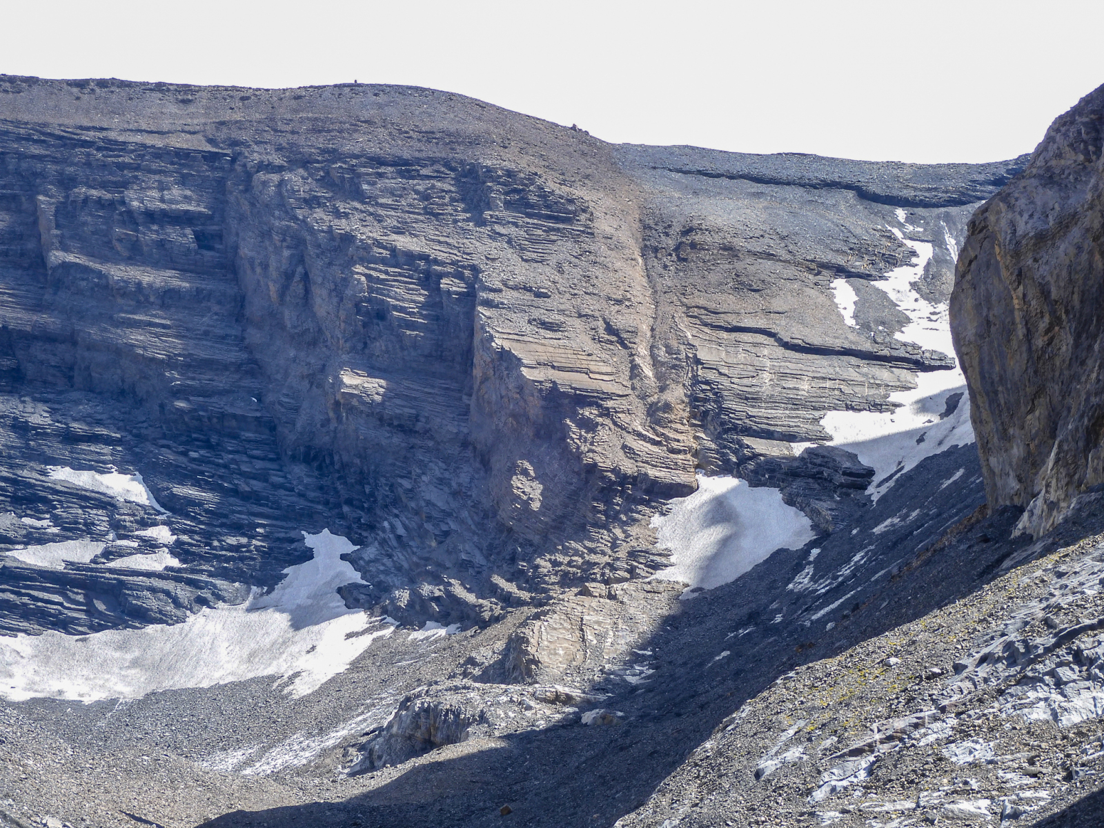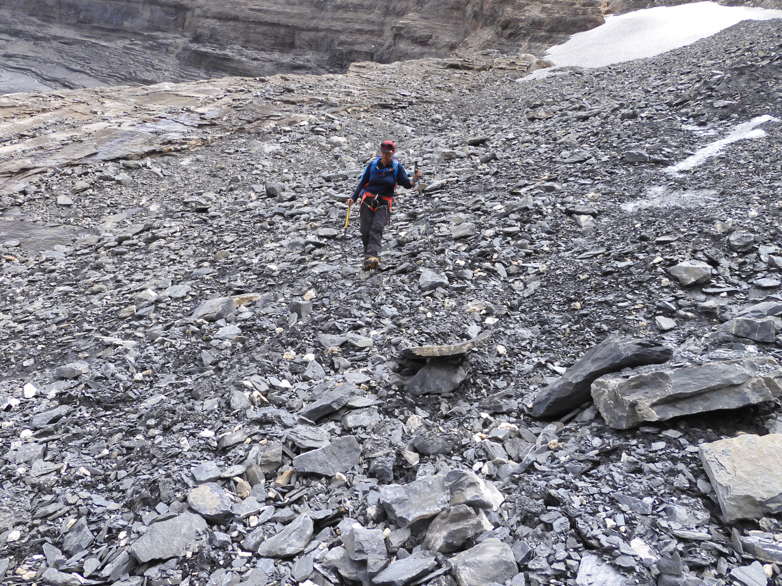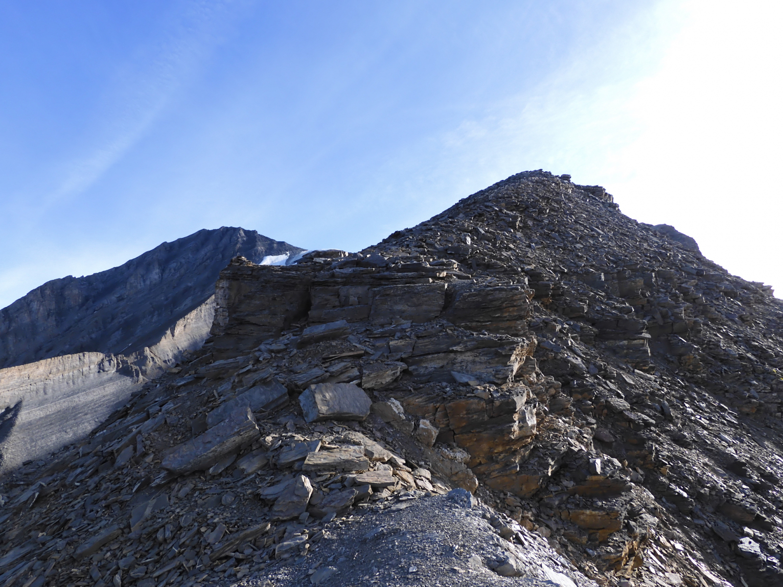 Nun folgt man dem felsigen Zackengrat, der im Sommer deutliche Wegspuren vorgibt. Dieser Wegabschnitt bietet bei trockenen Verhältnissen kaum Schwierigkeiten. Eine Steilstufe gegen Ende des Grates wird umgangen, indem man nördlich etwas ab- und anschliessend wieder zum Grat zurücksteigt. Man kann sie allerdings auch direkt angehen und überschreiten. Kurze zeit später heisst es Steigeisen anschnallen, man erreicht den breiten, mit Gletschereis bedeckten Gratteil, ein breiter Rücken und folgt diesem bis zum Vorgipfel. Direkt hinter dem Vorgipfel steigt man anschliessend ein wenig in einen Sattel ab und steigt anschliessend über den Firnhang zum Hauptgipfel. Auf dem Firnhang hat es Spalten.