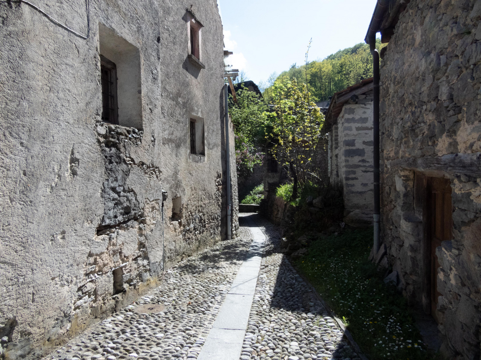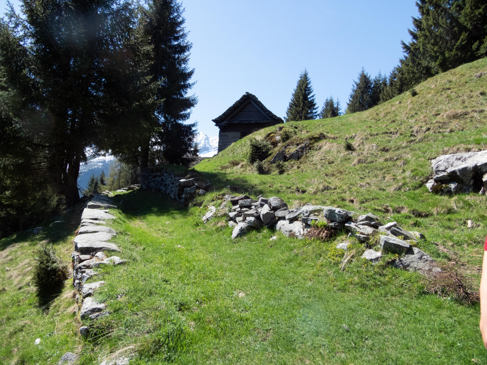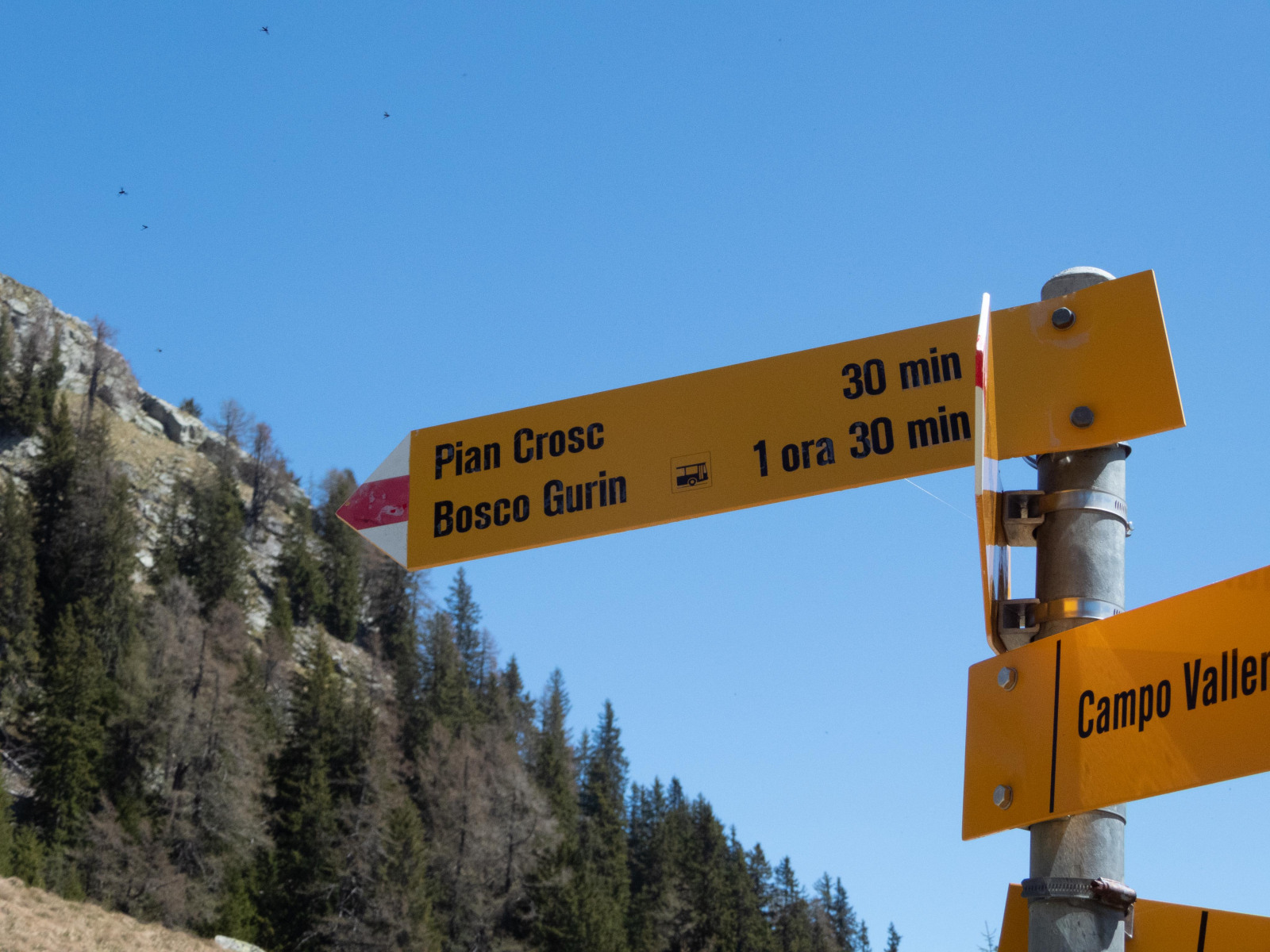 Gestartet wird im letzten Dorf vor Bosco / Gurin in Cerentino am unteren Dorfrand. Das Dorf erreicht man mit dem Postauto oder mit dem PW. Gleich beim Dorfeingang geht es rechts durch die ersten Häuser und man hält sich dann leicht nord-westlich und steigt Richtung Kirche auf. Den Schwenker zur Kirche kann man sich auch sparen und direkt Richtung Casa die Giünx aufsteigen. Man erreicht diese Häuser und läuft durch die schmale Gasse und es geht danach Richtung Cosopra, ebenfalls eine weitere Häuseransammlung. Nach dieser Häusergruppe befinden sich Ziegenställe, dort schwenkt man rechts ein und steigt leicht links haltend zum Waldrand hinauf. Einmal auf dem Weg ist alles klar. Nach gut einer Stunde erreicht man Pigliegn auf 1389 m. Es geht weiter und auf einer Waldlichtung trifft man auf einige Steinhäuser im Corte Bisàu. Jetzt wird es wirklich steil. In zahlreichen angenehmen Serpentinen geht es hinauf zur Alp Pian Crosc auf 1840 m. Und nach gut 3 Stunden erreicht man den gleichnamigen Passübergang. Je nach Steigleistung benötigt man vielleicht auch 30 Minuten mehr. Auf dem Pass lohnt sich eine Rast, um die Bergwelt des Bosco Gurin zu geniessen. Westwärts entdeckt man auch die Skianlagen des Walser Dorfes.
