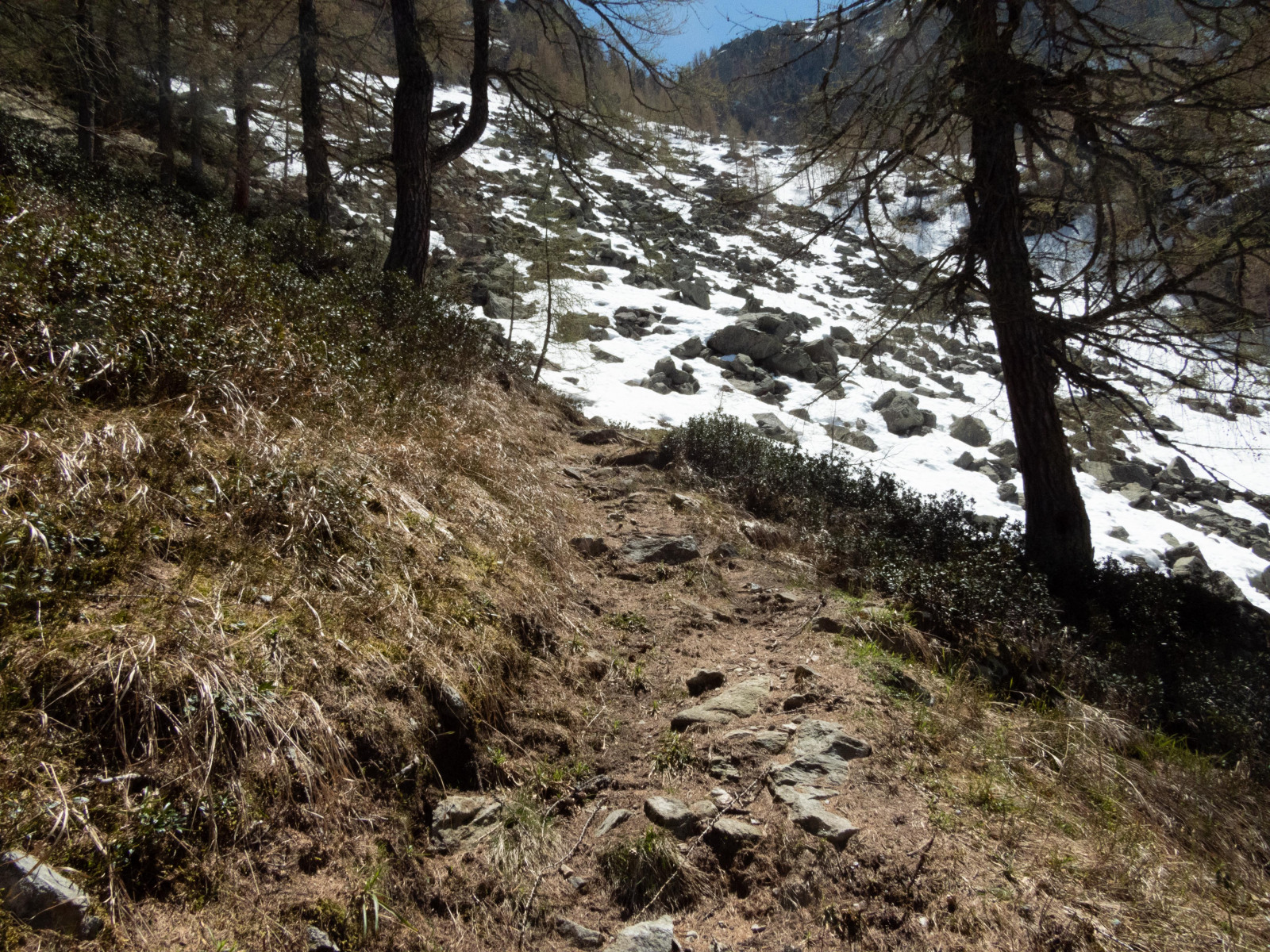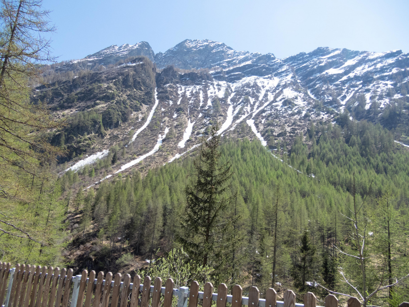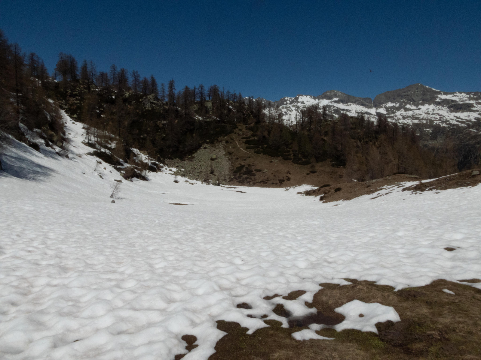 Im Frühling, bis etwa Mitte, Ende Mai liegt auf der Nordseite des Wyss Gufar meist noch Schnee. Der Abstieg gestaltet sich in dieser Zeit etwas heikel, weil in vielen Scharten noch sehr steile Schneefelder liegen. Der Schnee ist aber kompakt und am Nachmittag weich. Es lassen sich gute Spuren in die steilen Schneepassagen treten. Zwischendurch geht es auf normalem Weg talwärts. Mit geübtem Blick findet man Wegmarkierungen, sodass man den Abstieg nach Bosco / Gurin gut schafft. In dem malerischen Walser Dorf lohnt es sich, ein paar Minuten zu verweilen und die schöne Dorfarchitektur zu bewundern und zu studieren. Danach begibt man sich zum Dorfausgang. Beim Buswendeplatz und Hotel Walser läuft man zuerst rund 800 Meter die Strasse hinunter, bevor der Weg rechts weg dem Fluss entlang Richtung Cerentino geht. Der Weg dem Fluss entlang ist ein landschaftlicher Genuss.