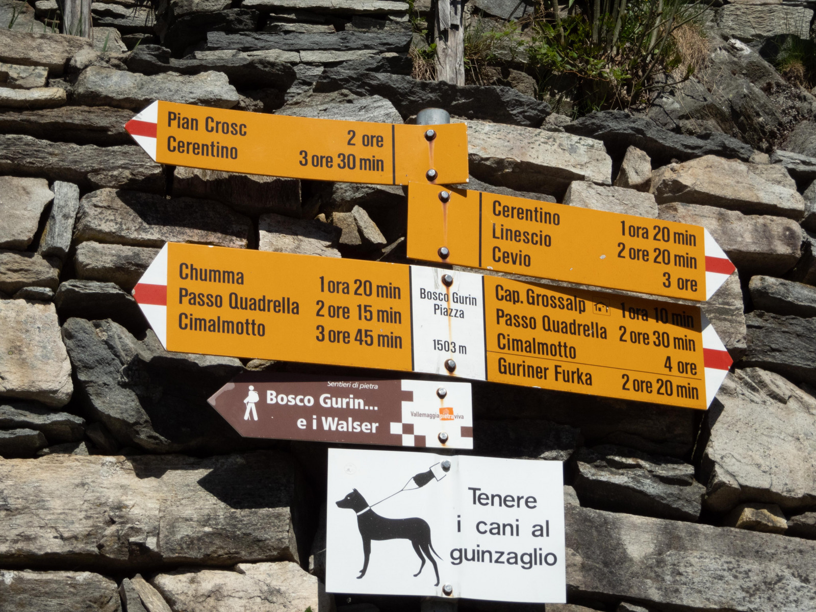 | Strecke | Cerentino 980 m – Cà di Giunzi – Corzora 1140 m – Corsopra – Pigliegn1389 m – Punkt 1417 – Corte Bisàu – Pian Cortone – Pian Crosc 1840 m – Pian Crosc 1926 m – Alp Bobna 1741 m – Plàttulti – Boda 1471 m – Bosco Gurin 1503 m – Tenzaboda – Wo Ginochi – Geschanu – Percheggu – Al Ciòs 1206 m – Pila Isola – Sasso dell’Aqua – Carbonera di Fuori – Cerentino 980 m |