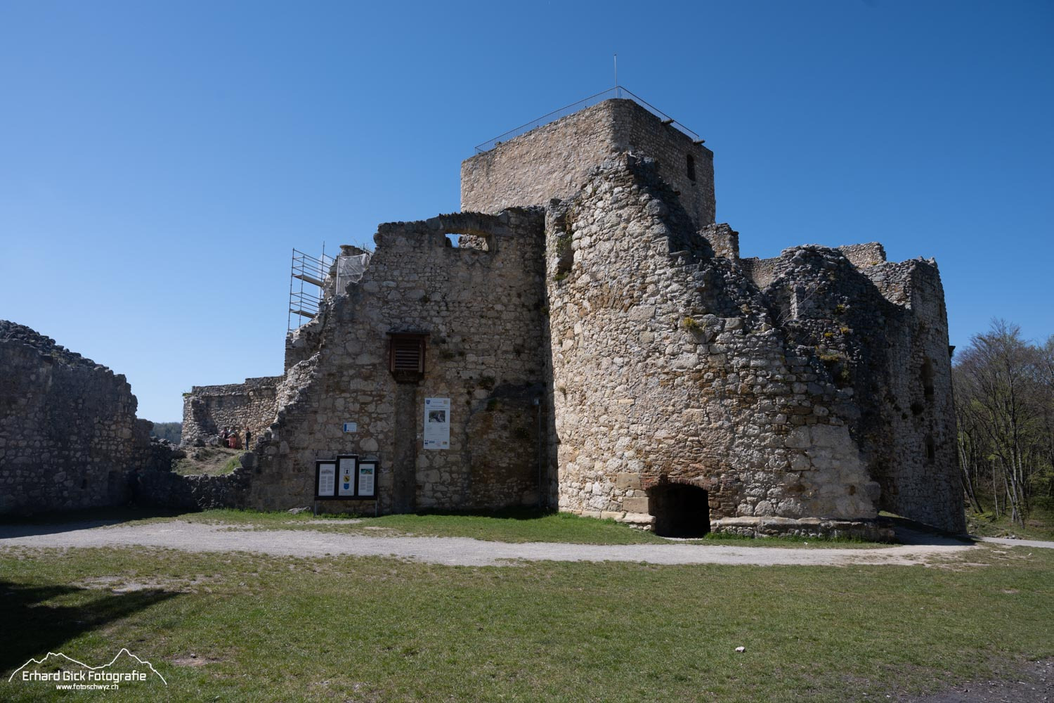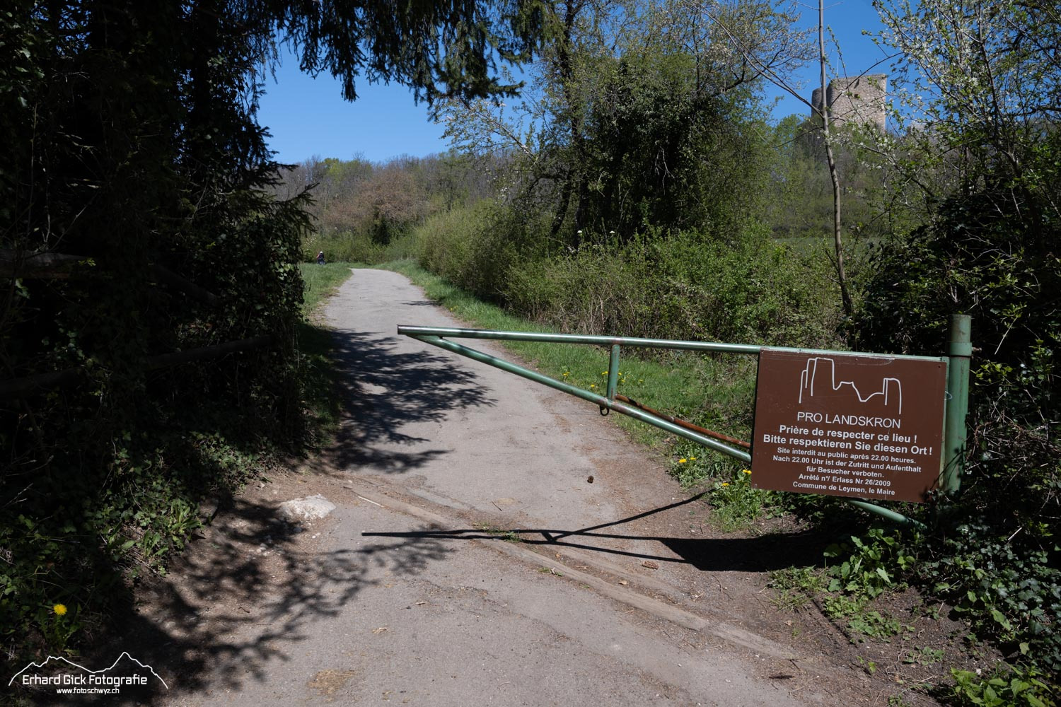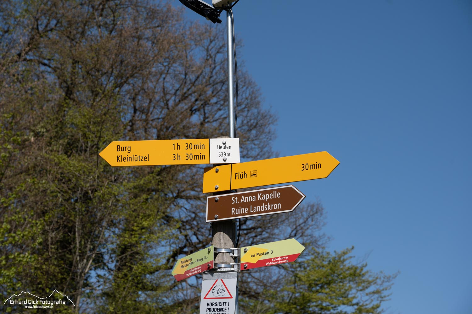 Der Weg startet von Mariastein 1 nordwärts, folgt der Hangkante zum Flühtal, zum Heulenhof und einem lindenreichen Schutzwald und führt Richtung Norden zur St.-Anna-Kapelle und zum ersten Aussichtspunkt auf der Landesgrenze – mit Blick zurück auf die Klosteranlage und auf die Landskron im Norden. Diese einst stolze Krone der Landschaft thront immer noch dominant über dem Birsigtal. Ein kleiner Weg führt ziemlich steil von der Burgruine unter dem Felsen durch. Ungeübte benützen besser den Abstieg von der Landskron. Man gelangt auf demselben Weg zurück zur Schweizer Grenze, hält dann aber rechts und folgt dem Strässchen. Der Weg ist gut markiert. So gelangt man wieder hoch zum Heulenhof. Es folgt ein leichter Abstieg zu einer Siedlung nördlich von Mariastein. Ein paar Meter geht es auf der asphaltierten Strasse westwärts. Bei Punkt 537 erreicht man den Wald. Jetzt geht’s durchs Niderholz zum Geissberg. Dort läuft man der schweizerische-französischen Grenze entlang bis nach Burg im Leimental. Das letzte Wegstück führt nach Metzerlen, einem malerischen Bauerndorf, wo die landschaftlich eindrucksvolle Wanderung endet.