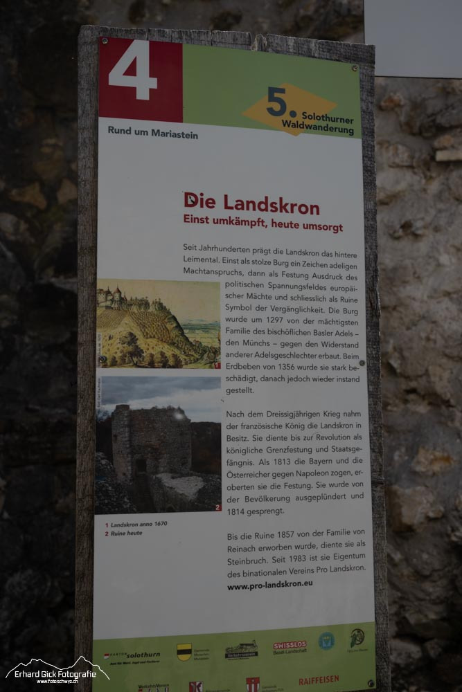 Der Solothurner Waldwanderweg um Mariastein ist eine Teilwanderung dieses rund 44 Kilometer langen Wanderweges. Er führt teilweise der französischen Grenze entlang. Die schöne Klosteranlage Klosteranlage und die Burgrunie Landskron sind nur einige Höhepunkte.